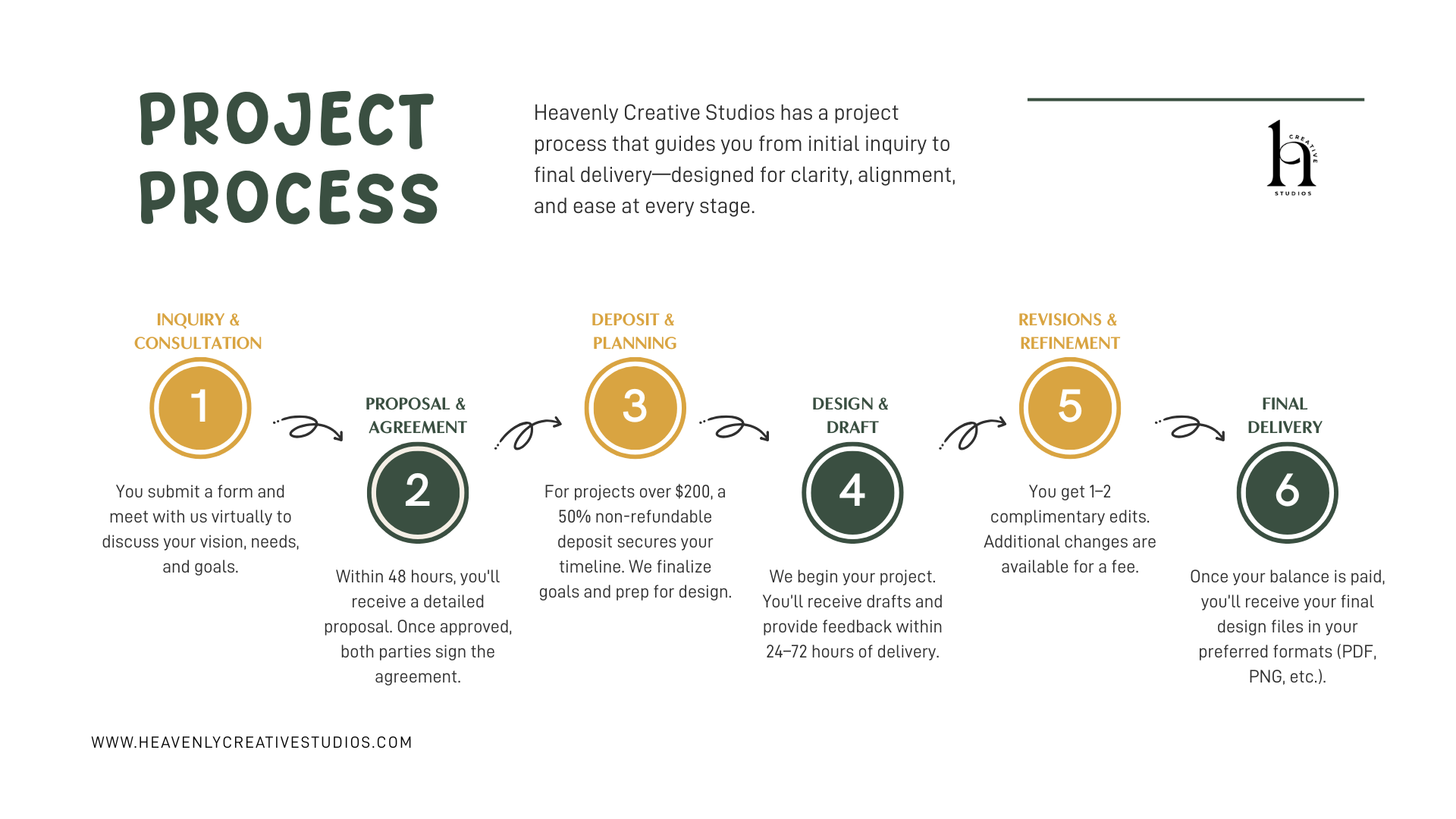 At Heavenly Creative Studios, we believe in clear communication and mutual understanding. To ensure a smooth and aligned design experience, we kindly encourage you to review our design policy before reaching out. It outlines our creative process, collaboration expectations, and key terms so you know exactly what to expect. If anything needs clarification, we’re always here to answer your questions—your confidence and clarity matter to us